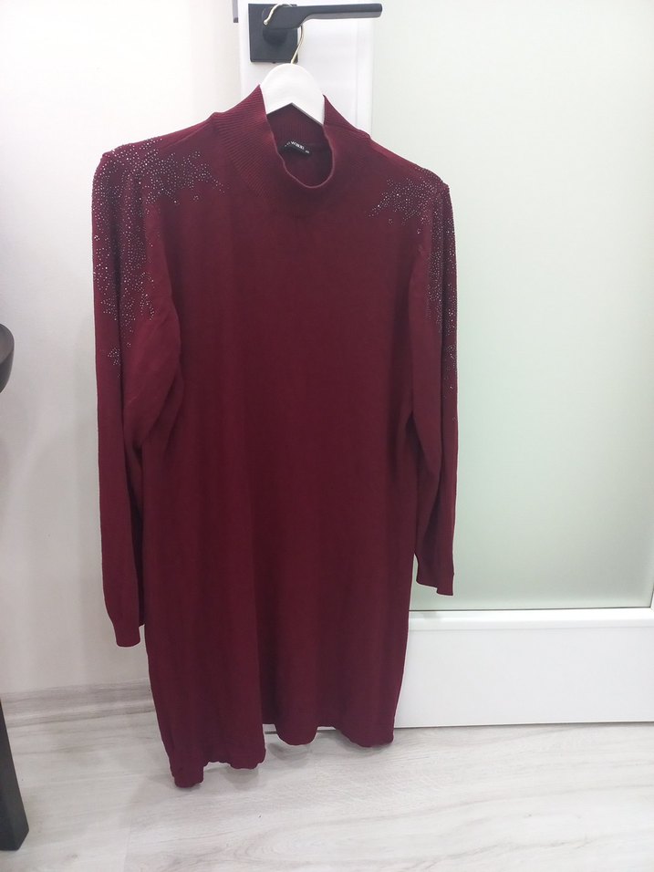 Bordo renkli, balıkçı yaka ve uzun kollu triko tunik, rahat kesimiyle günlük kullanıma uygundur.