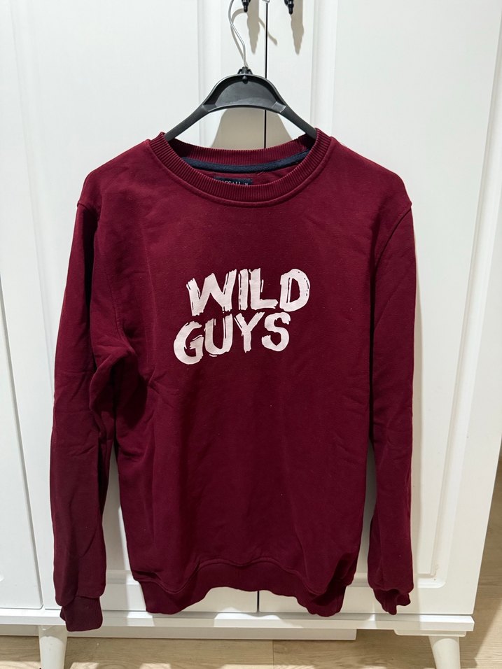 Bordo renkli, uzun kollu, yuvarlak yakalı ve bol kesim sweatshirt. Önünde 'WILD GUYS' baskısı bulunur, yumuşak ve sıcak kumaştan yapılmıştır.