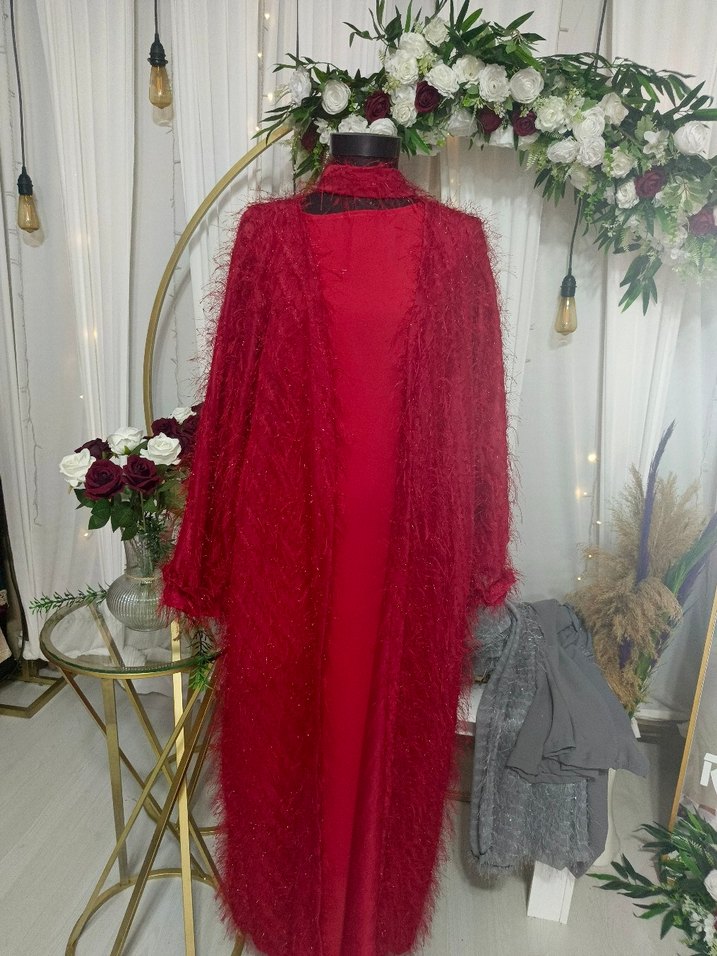 Bordo renkte, uzun kollu ve salaş kesim bohem tarzda uzun elbisedir. Kayık yaka ve dokulu ince kumaş detaylarıyla şık bir görünüm sunar.