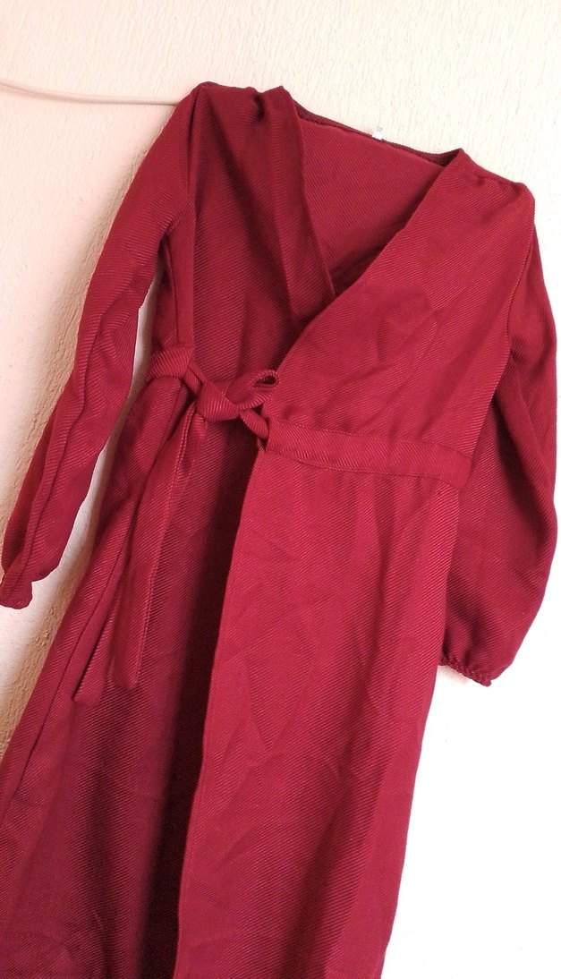 Parlak bordo renkte, uzun kollu ve bol kesimli, desen içermeyen minimalist bohem tarzda uzun boy kadın elbisesi.