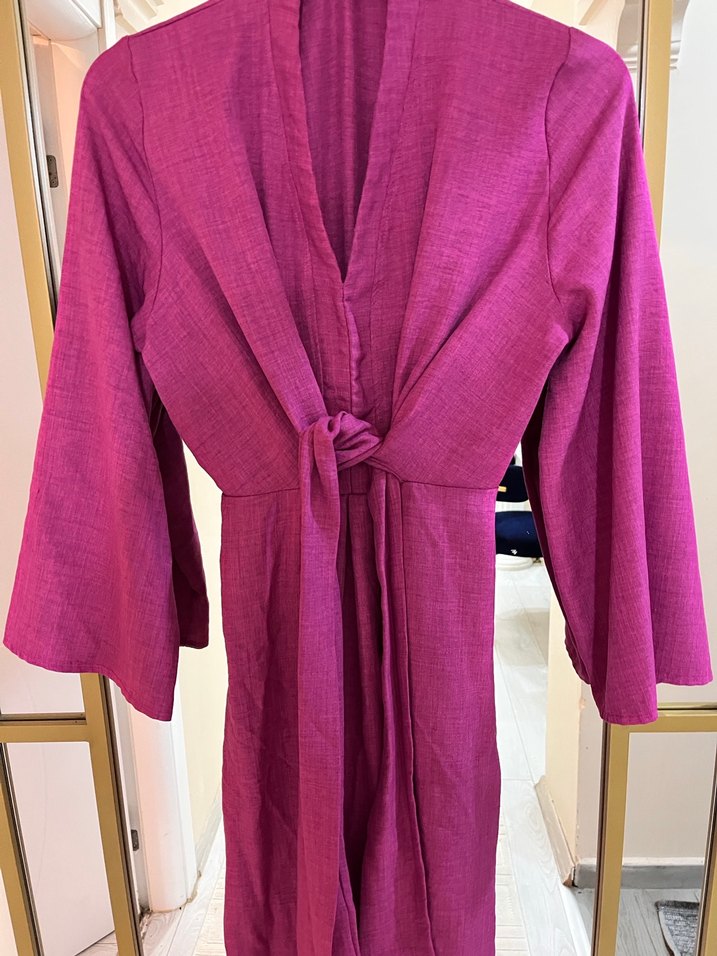 Parlak bordo renkte, uzun kollu ve bol kesim bohem tarzda kadın sabahlık. Önünde bağlama detayı vardır.