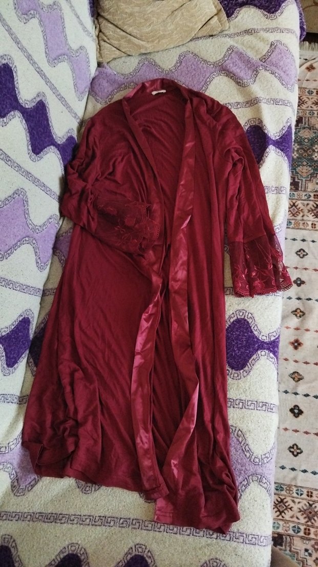 Bordo renkli, uzun kollu ve dantel detaylı bohem tarzda, rahat kesim kadın geceliktir. Desensiz kumaşı şıklık katar. M beden sadece kemeri yok