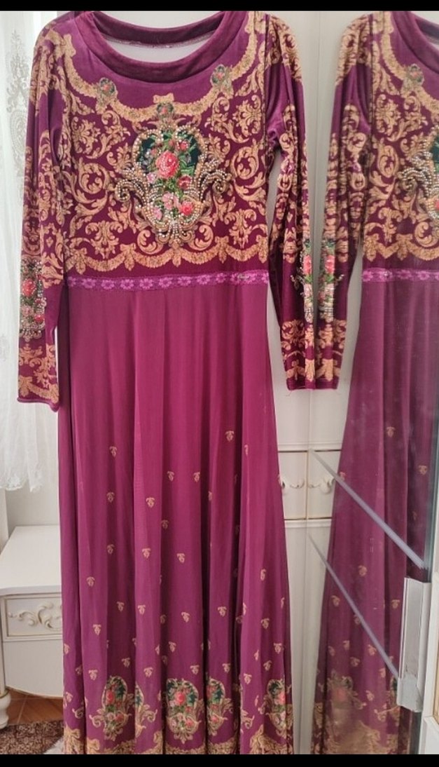 Bordo renkli, uzun kollu, V yakalı, bol kesim ve drapeli bu Hint elbisesi, detaylı işlemelere sahip olup düğün ve bohem tarz için uygundur.