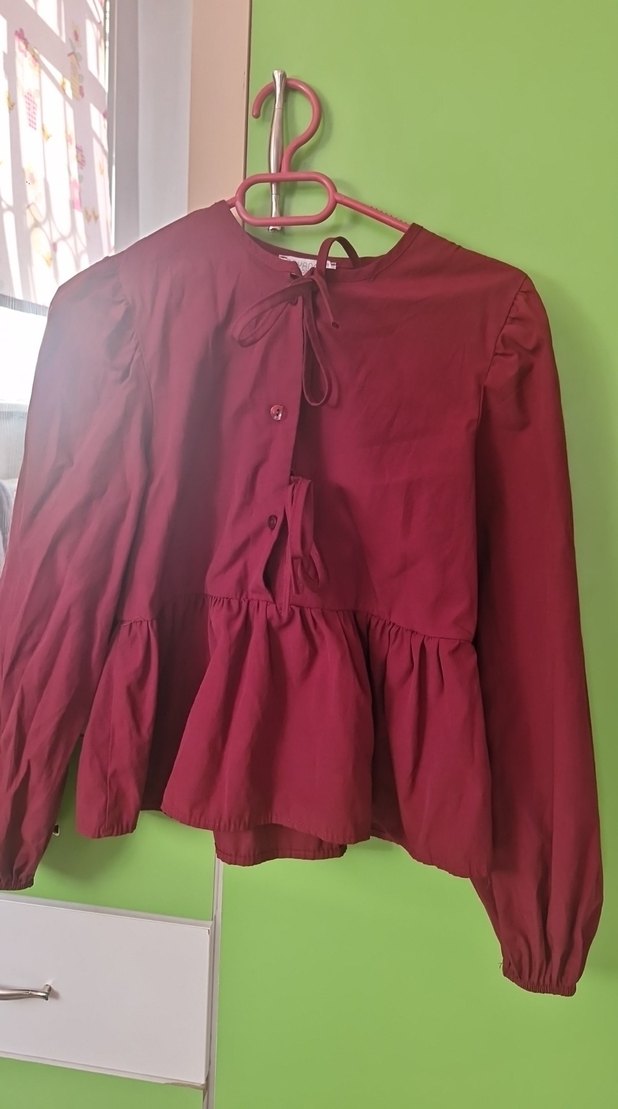 Bordo renkli, uzun kollu, düğmeli ve salaş kesim kız bluzu. Bohem tarzda, yumuşak sentetik kumaştan üretilmiştir.