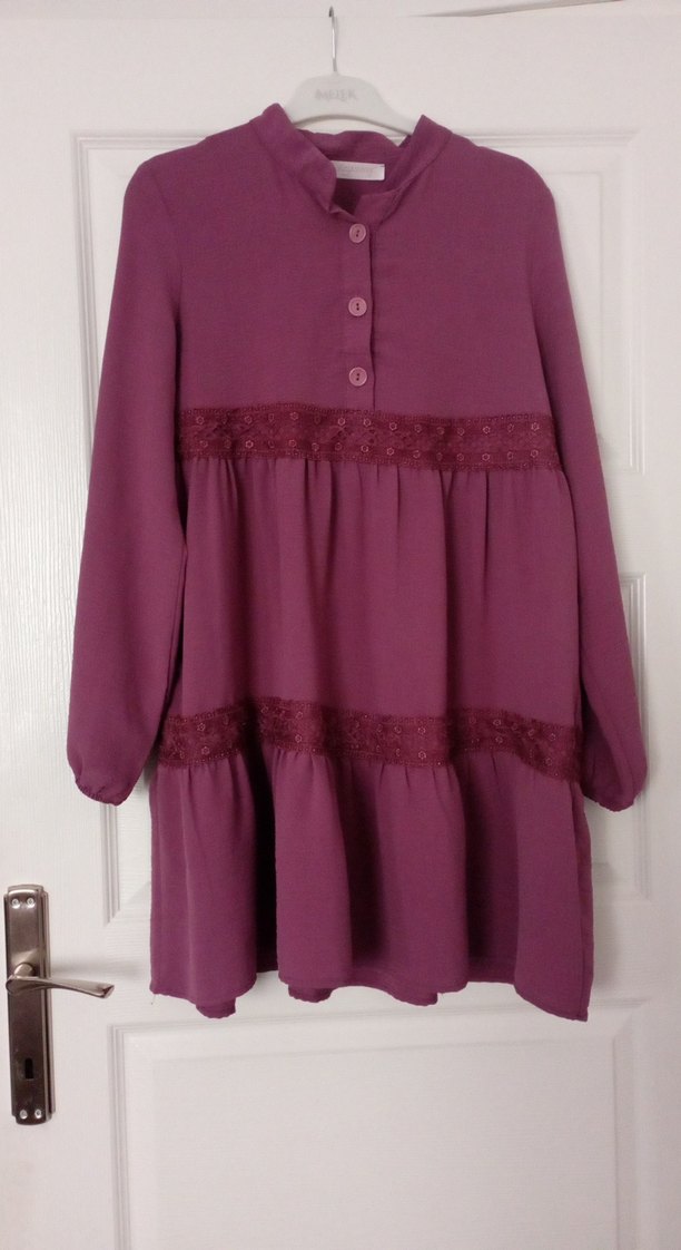 Bordo renkli, yüksek yakalı ve fırfır detaylı triko tunik. Salaş kesimi ve midi boyuyla ofis için uygun, uzun kollu bohem tarzda.