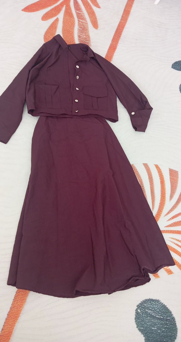 Bordo renkte, düğmeli ve uzun kollu, bol kesim uzun elbise. Sentetik kumaştan, notlu yaka ve vintage bohem tarzına sahip. Günlük kullanım için uygun.