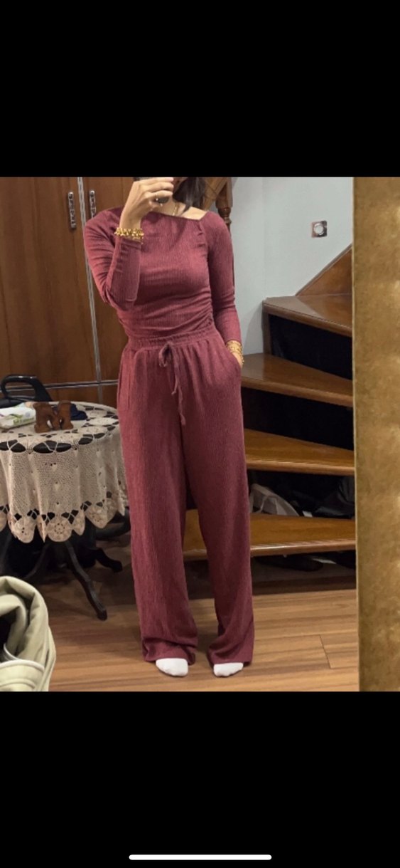 Bordo renkte, bol kesim ve uzun kollu takım çok rahatdır S beden