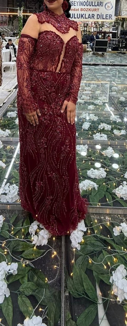 Bordo renkli, uzun kollu ve boncuk işlemeli özel tasarım elbise bir kere gıyılmıstır sadece
