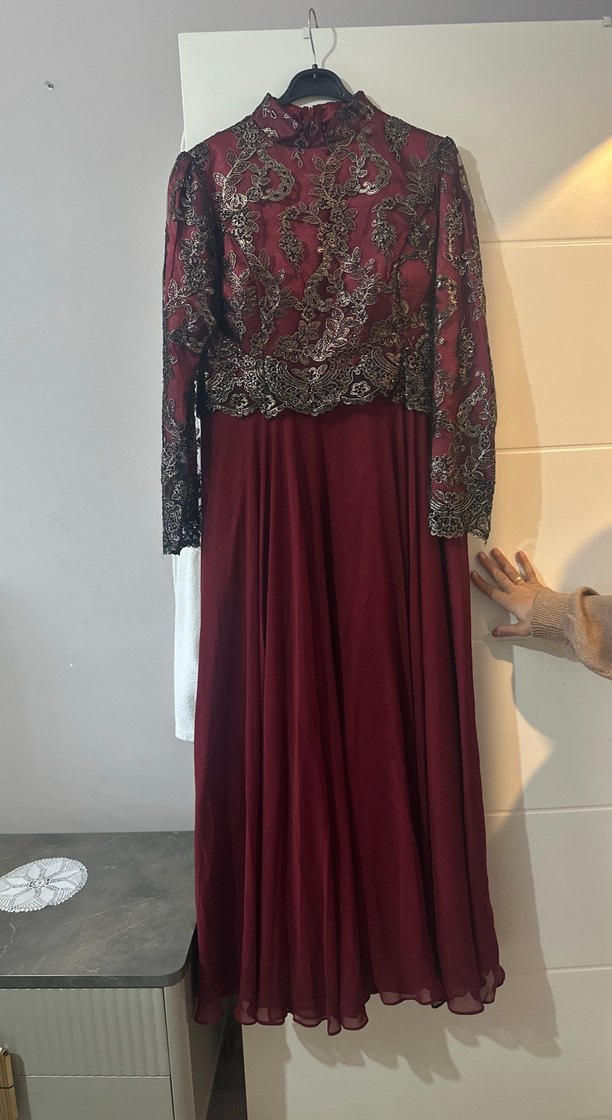Bordo renkte, drapeli ve desenli dantel üst kısmı olan, uzun kollu ve yüksek yakalı, bol kesim uzun abiye elbise. Düğünler için uygundur.