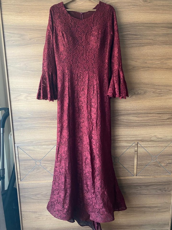 Bordo uzun kollu, dantel işlemeli ve tekne yaka detaylı, vücuda oturan sentetik kumaş elbise. Vintage düğünler için uygun şık bir model.