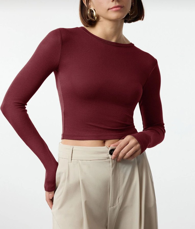Bordo renkli, yuvarlak yakalı ve uzun kollu dar kesim bayan bluz. Düz ve sentetik dokulu, günlük sokak modasına uygun şık ve rahat bir parça. Midi boyda, sade tasarım.
