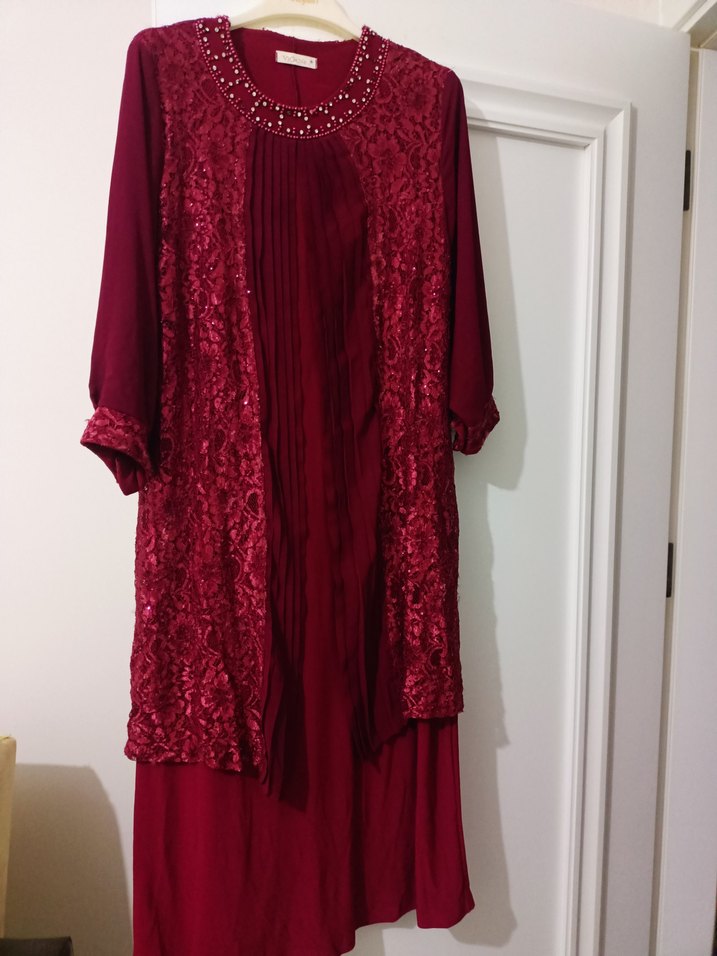 Bordo renkli, uzun kollu, desenli ve drapeli kadın elbisesi. Yüksek yakalı ve bol kesim, ipeksi dokuda, düğünler için uygundur. 40-44 bedene kadar uyumludur.