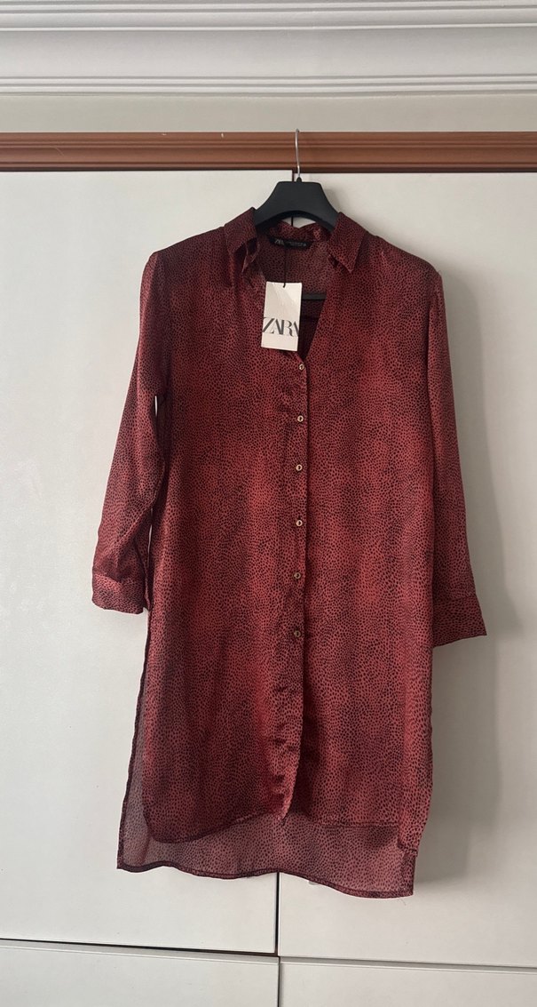 Bordo renkli, uzun kollu, düğmeli, kadın gömleği. Bol kesim ve V yaka. Günlük kullanıma uygun bohem tarzda, sentetik kumaştan.