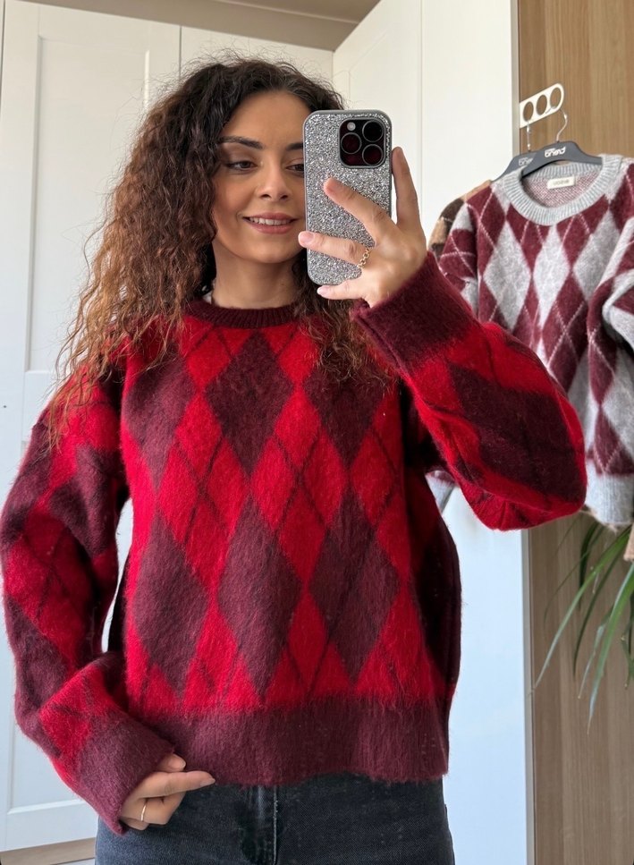 Bordo Uzun Kollu Desenli Triko Kazak