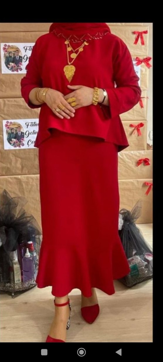 Bordo renkli, dökümlü tasarımlı, uzun kollu, klasik kesim kadın elbisesi. Notched lapel yaka ve parlak baskılı deseni vardır. Düğün için uygundur.