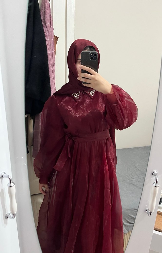 Bordo renkli, uzun kollu ve dökümlü detaylara sahip bol kesim elbise. Yüksek yakalı, mütevazı ve gotik tarzda günlük kullanıma uygun. Şalı da vardır .