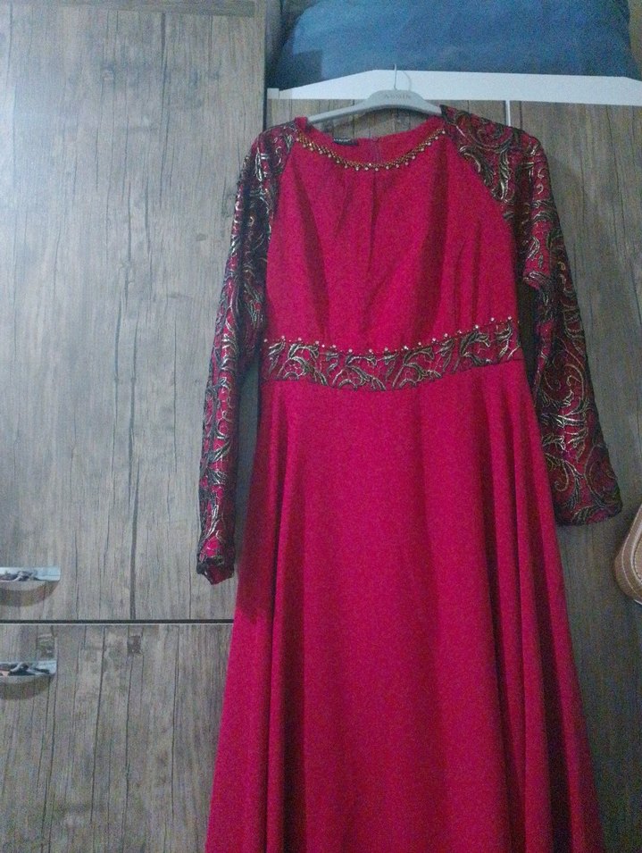 Bordo renkte, yüksek yakalı, uzun kollu ve desenli vintage tarzda, dökümlü bol kesim abiye elbise, düğünler için uygundur. 3 beden