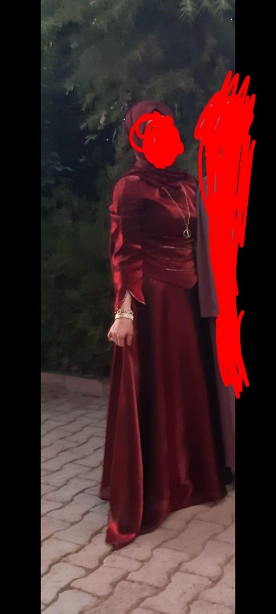 Bordo renkli, uzun kollu ve yüksek yakalı bu drapeli abiye elbise, klasik ve gotik tarzı bir araya getirir. Düğünler için uygun şık bir modeldir.