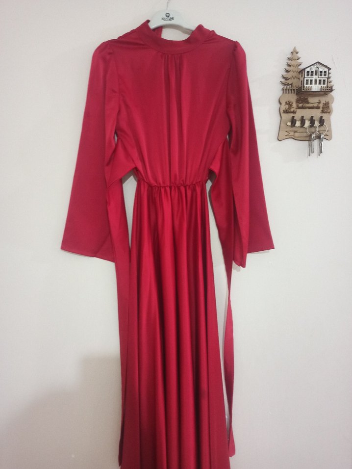 Bordo renkte, yüksek yakalı ve uzun kollu, bol kesim, satenimsi kumaştan yapılmış drape detaylı uzun elbise. Düğünler için uygun, çağdaş tarzda.elimde 2 tane var