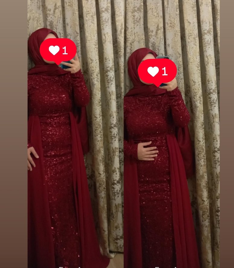 Bordo renk, uzun kollu ve yüksek yakalı bu dar kesim elbise, drapeli detaylarıyla gösterişli düğünlere uygundur. Desenli kumaşıyla sade ve şık bir görünüm sunar. şalı ile birlikte kiralık piyasadır 38-40 beden ile uyumlu