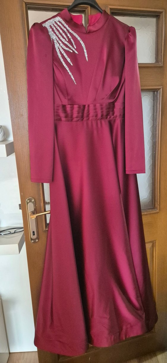 Bordo renkte, uzun kollu, drapeli tasarıma sahip abiye elbise. Tek renk ve parlak kumaş ile klasik ve modern çizgiler sunar.