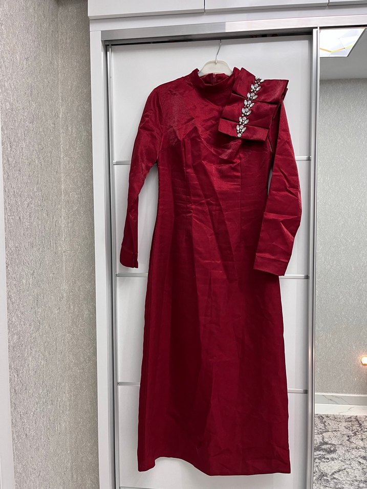Bordo uzun kollu, yüksek yakalı ve drapeli detaylı abiye elbise. Parlak kumaşı ve düzenli kesimi ile düğünler için uygundur. M ama kalıbı biraz dar ondan s işaretliyorum bilginiz olsun