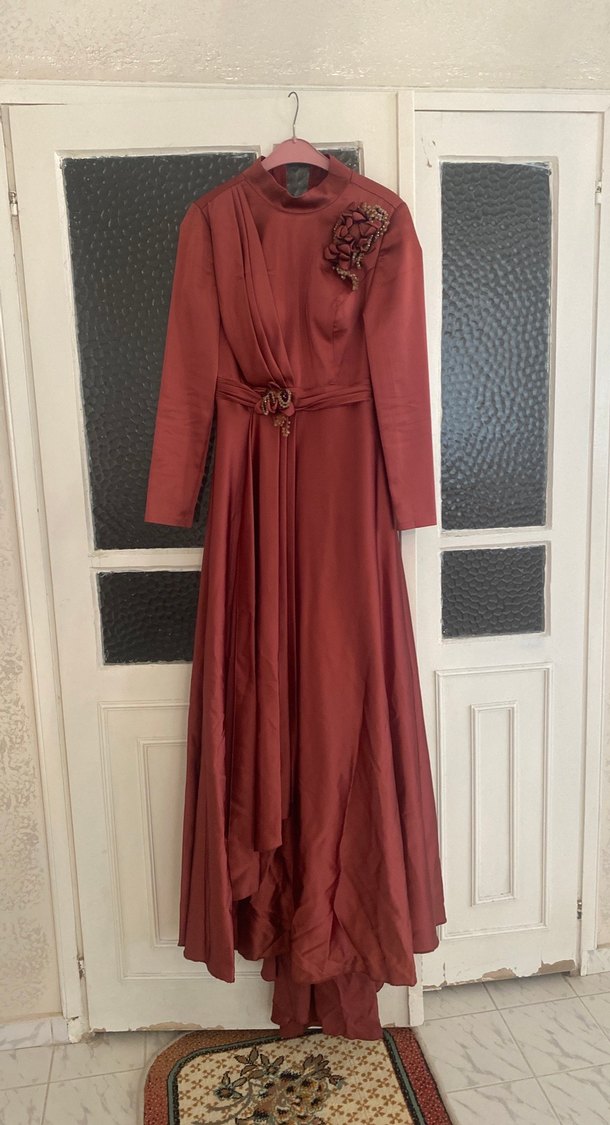 Bordo uzun kollu abiye elbise, yüksek yakalı ve bol kesimdir. Drapeli detaylar ve çiçek süslemeleriyle düğünler için uygundur. Modern klasik tarzda, vintage şıklığı yansıtır. Elbise ile bütün arkadan uzanan kuyruğu var. Elbisenin üstünde ki çiçek süslemeleri çıkartılabiliyor.