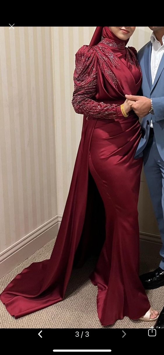 Bordo, uzun kollu, drapeli ve parlak dokulu bu dar kesim abiye elbise, düğünler için modern klasik bir şıklık sunar.