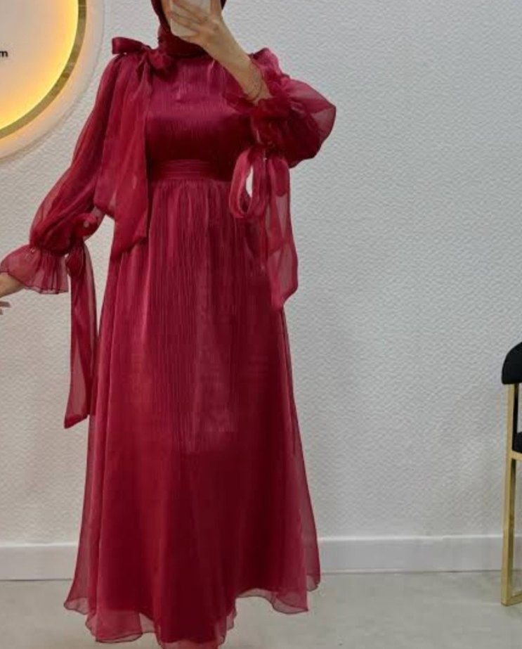 Bordo renkli, yüksek yakalı ve uzun kollu drapeli abiye elbise. Parlak kumaşı ve hafif batik deseniyle düğünler için uygundur.