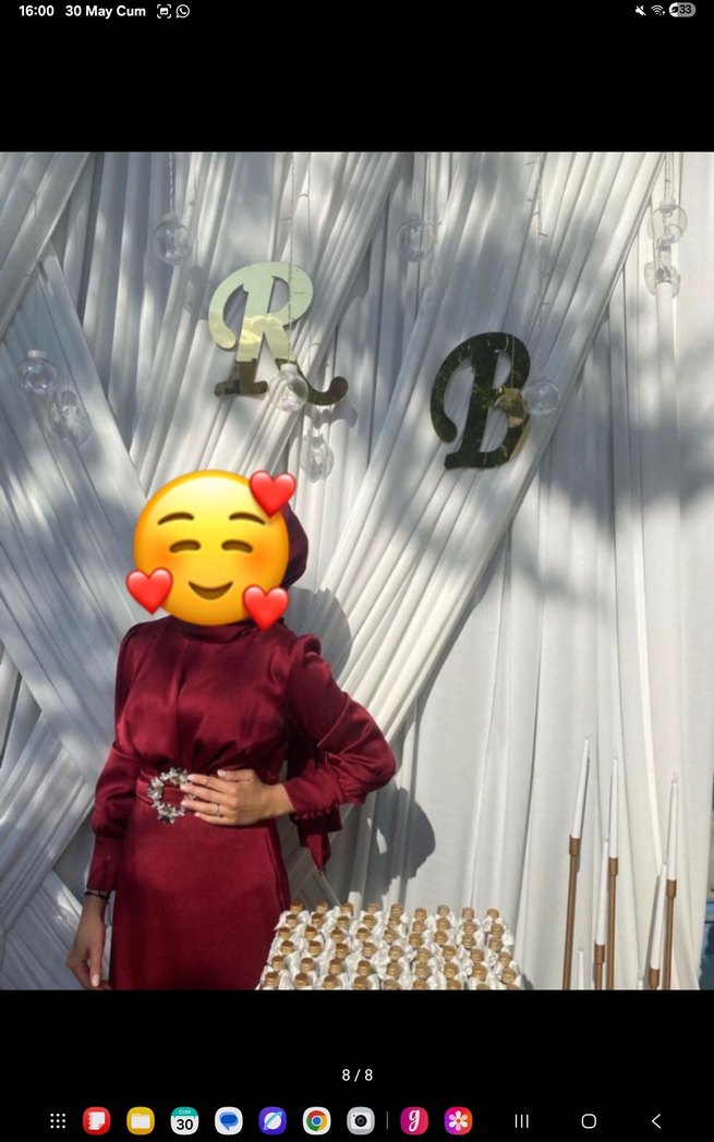 Bordo, uzun kollu ve yüksek yakalı bu dar kesim nişan elbisesi parlak batik desenli ve şık drapeli detaylara sahiptir. kemerinin altında ve eteginde tiftiklenme mevcuttur ama uzaktan belli olmuyo şifon şalla beraber göndericem
