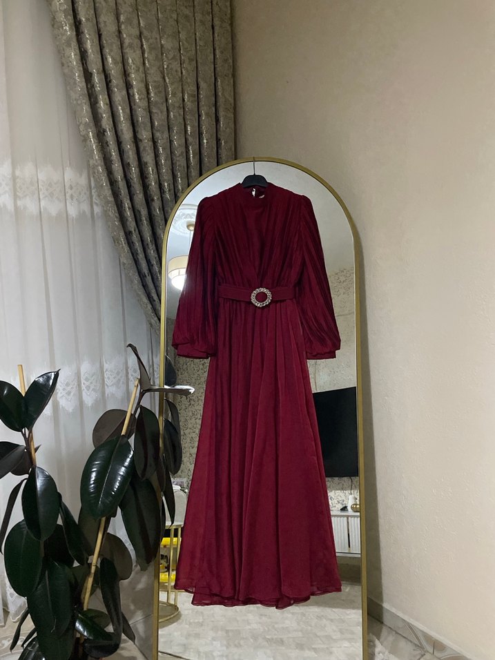 Bordo renkte, uzun kollu, yüksek yakalı ve drapeli salaş kesim abiye elbise, düğün ve özel davetler için uygundur.