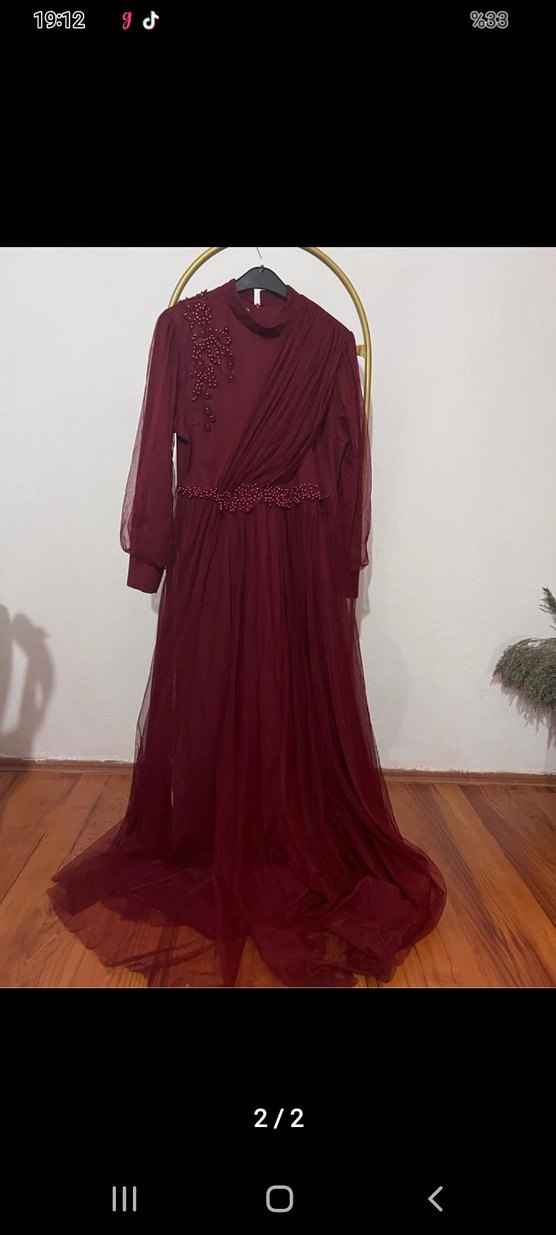 Bordo renkli, uzun kollu ve yüksek yakalı bu abiye elbise, bol kesimi ve drapeli detaylarıyla düğünler için uygundur.