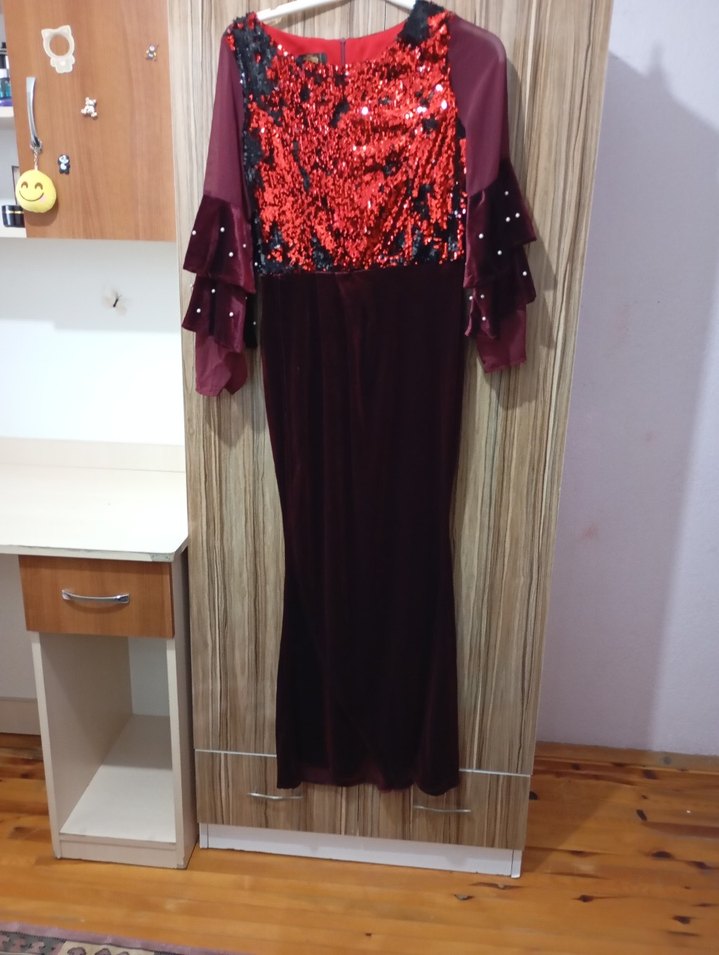 Bordo uzun kollu, v yaka ve drapeli detaylara sahip dar kesim abiye elbise. Üst kısmı kırmızı pul işlemeli, etek kısmı koyu renkli düz kumaşlıdır.