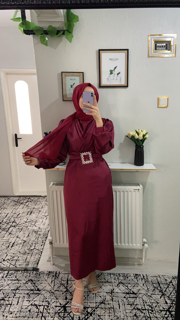 Kemeri farklı kemer gelebilir 40-42 beden Tertemiz ürün Şal dahil Bordo renkli, uzun kollu ve yüksek yakalı bu dar kesim abiye elbise, drapeli detaylar ve süslü kemerle şık ve mütevazı bir görünüm sunar.