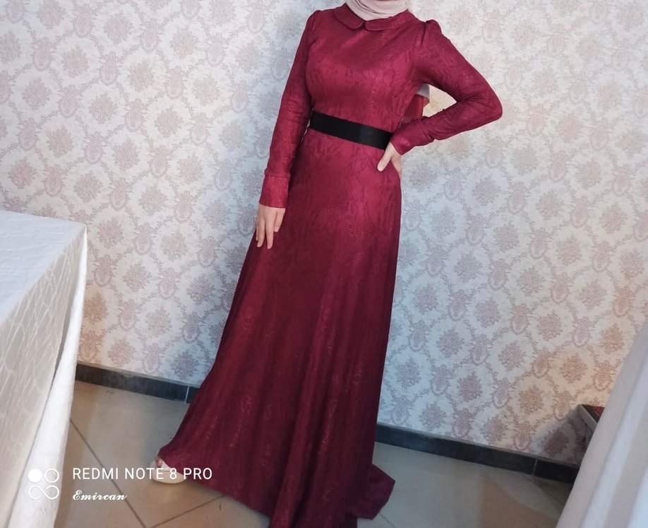 Bordo renkli, yüksek yakalı ve uzun kollu, drapeli detaylı, beli siyah kuşaklı uzun abiye elbisedir. Düğünler için uygundur.