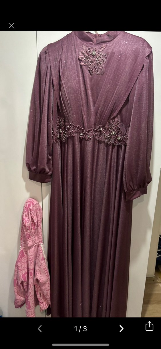 Bordo renkli, V yakalı ve uzun kollu, drapeli tasarıma sahip uzun abiye elbise. Bol kesimi ve boncuk işlemeli bel detayı ile düğünler için uygundur.✨