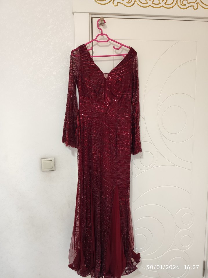 Bordo renkli, uzun kollu ve V yakalı bu abiye elbise, parlak dokusu ve drapeli detaylarıyla klasik ve modern bir şıklık sunar. ✨