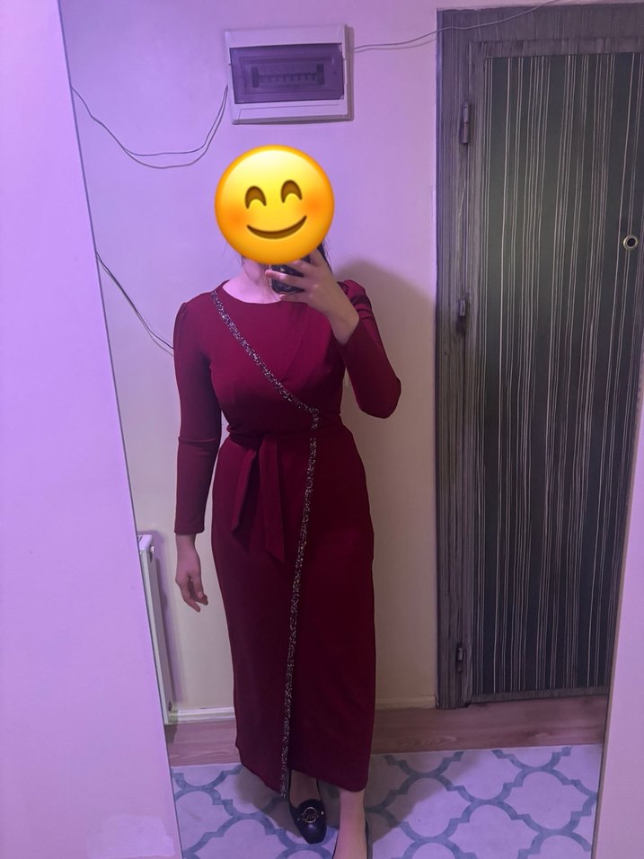 Bordo renkte, uzun kollu ve V yakalı, drapeli detaylı, taşlı parlak kumaştan yapılmış, uzun ve vücuda oturan abiye elbise. AA etiketi içerir. 36 38 beden uyumludur