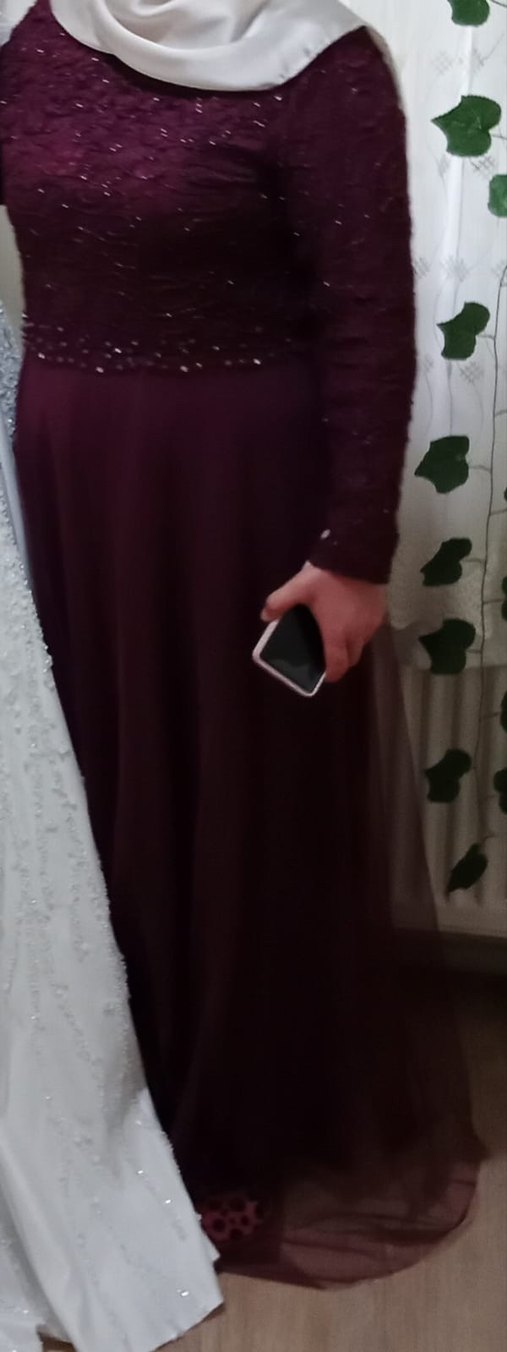 Bordo renk, uzun kollu ve drapeli tasarıma sahip bu dar kesim abiye elbise, sade ve mütevazı stil sunar. Düğün gibi özel günler için uygundur. 2 adet elbise ayrı ayrı fiyattır gri 48 mor 52 beden