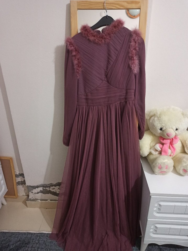 Bordo renkte, yüksek yakalı ve uzun kollu, drapeli tasarıma sahip uzun abiye elbise. Gevşek kesimli ve vintage esintili, düğünlere uygun. Yumuşak tüy detaylarıyla özel bir dokunuş sağlar. bir kere giyildi şalıda da isteyen alabilir ekstra