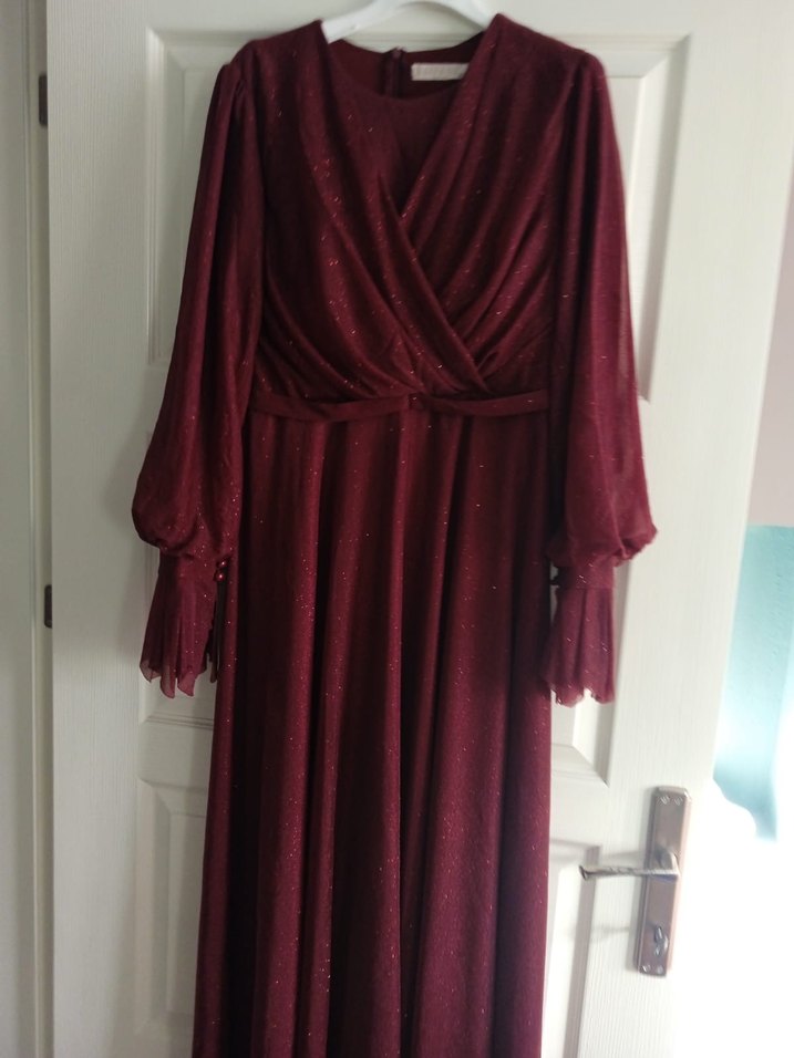 38 40 42 beden uyumludur Bordo renk uzun kollu, , drapeli ve bol kesim abiye elbise. Modern klasik tarzda, düğünler için uygundur ve gösterişli bir şıklık sunar. Simlidir