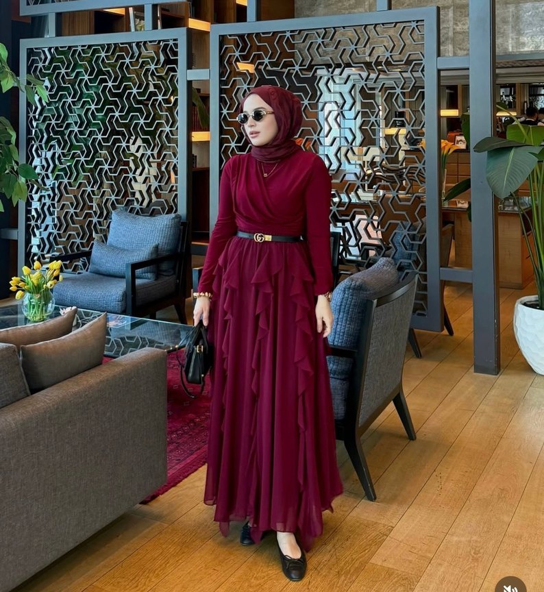Bordo renkli, uzun kollu ve yüksek yakalı bu uzun elbise, bol kesimi ve drapeli tasarımıyla dikkat çeker. Desenli kumaşıyla bohem ve şık bir görünüm sunar.