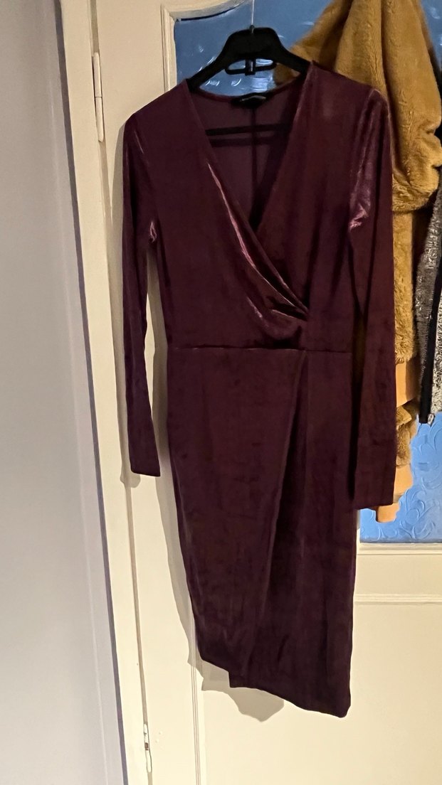 Bordo renkli, drapeli uzun kollu ve V yakalı, kış için uygun, modern kesim kadife elbise mora çalan bir rengi var s-m uyumludur.1 defa giyildi her hangi bir deformasyon mevcut değildir.