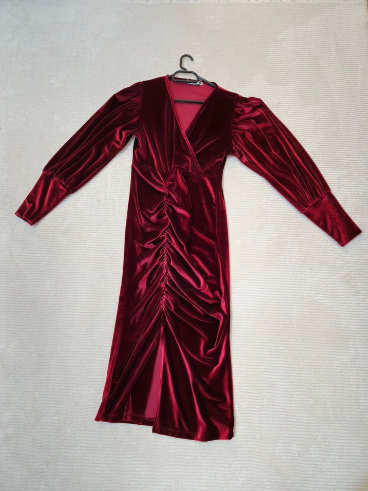 Bordo renk, v yaka ve uzun kollu, drapeli detaylara sahip, balık model. yırtmacı vardı çok az dikildi. vücudu tam sarıyor.