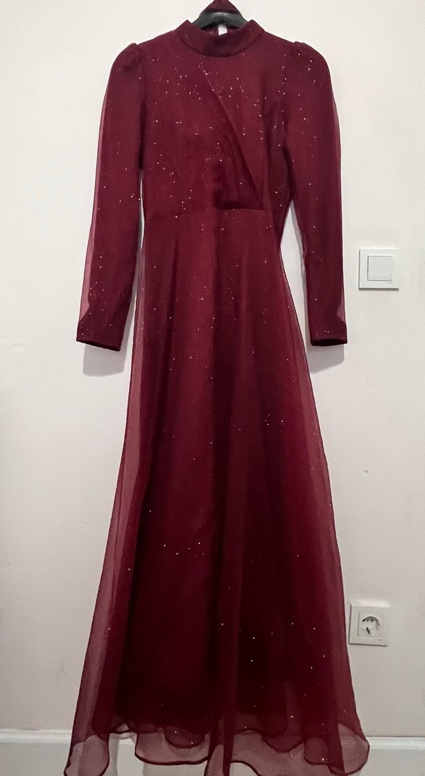 Bordo renkte, uzun kollu ve drapeli, klasik şıklıkta, düğünler için uygun, modern kesim ve notched lapel yaka detaylı dar kesim abiye elbise. ✨