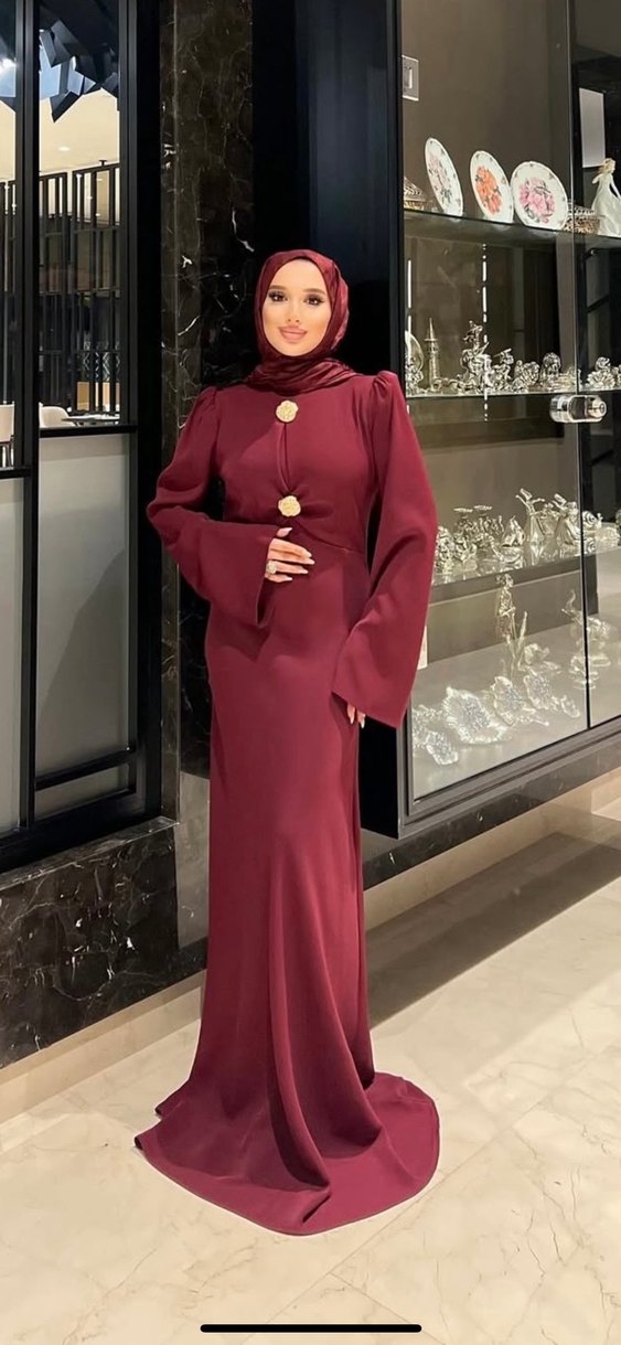 Bordo renkte, uzun kollu ve yüksek yakalı bu uzun abiye, drapeli tasarımıyla sade ve şık bir görünüme sahiptir. 1 kere giyildi kusuru yoktur…