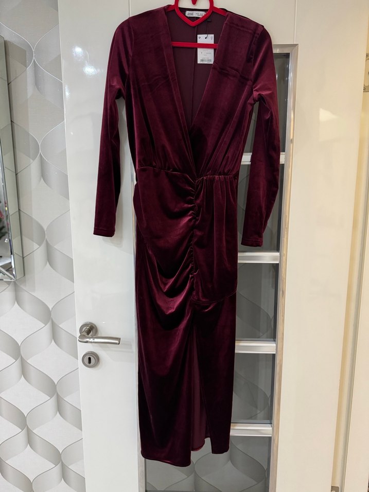 Bordo renkli, uzun kollu ve V yaka, drapeli detaylara sahip dar kesim kadın abiye elbisedir. Romantik akşamlar için uygundur.