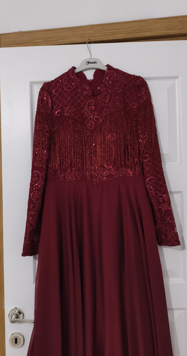 Bordo Uzun Kollu Drapeli Kadın Abiye Elbise