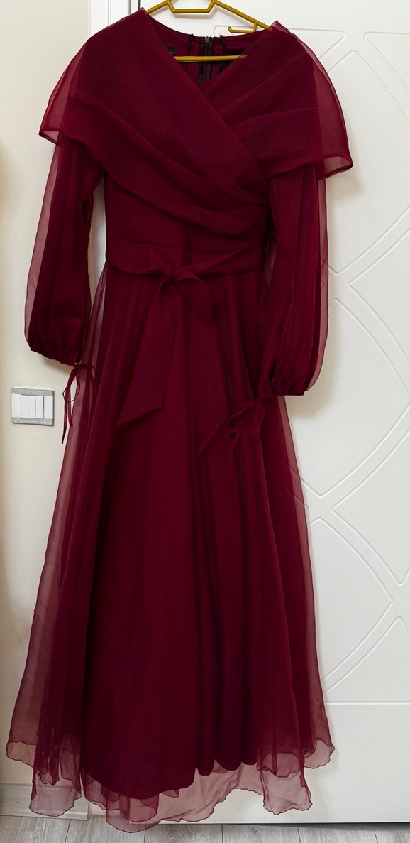 Bordo renkte, uzun kollu ve drapeli detaylara sahip bu abiye elbise, tek renk ve uzun boydadır. Düğün gibi özel anlar için uygundur.