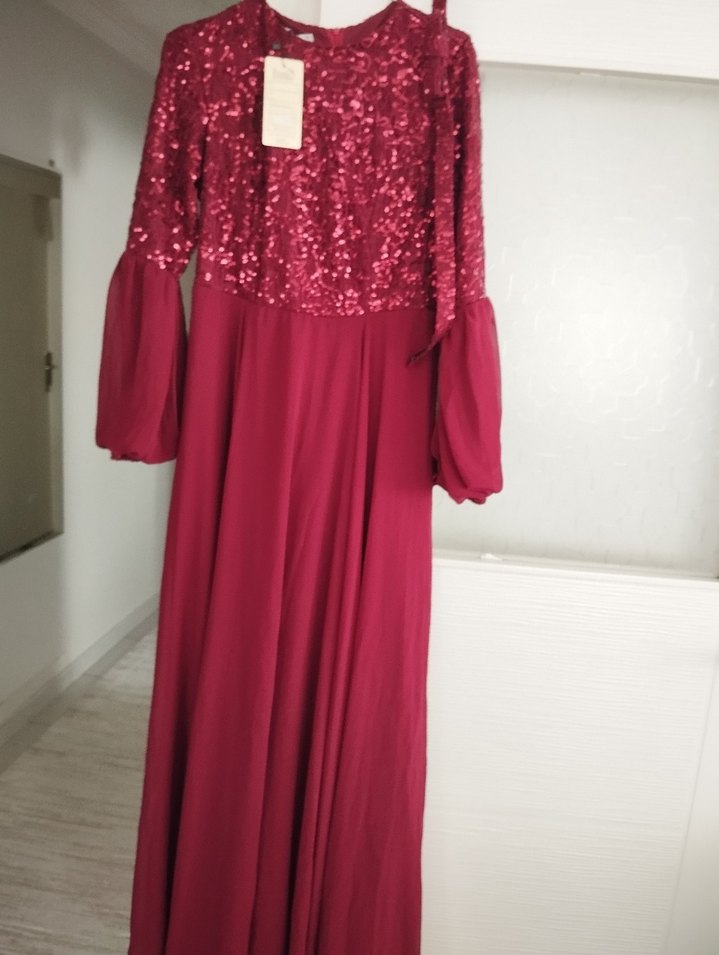 Bordo renk, uzun kollu, drapeli ve bol kesim kadın abiye elbise. Parlak desenli üst kısmı ve yuvarlak yaka detayı ile düğünlere uygundur.